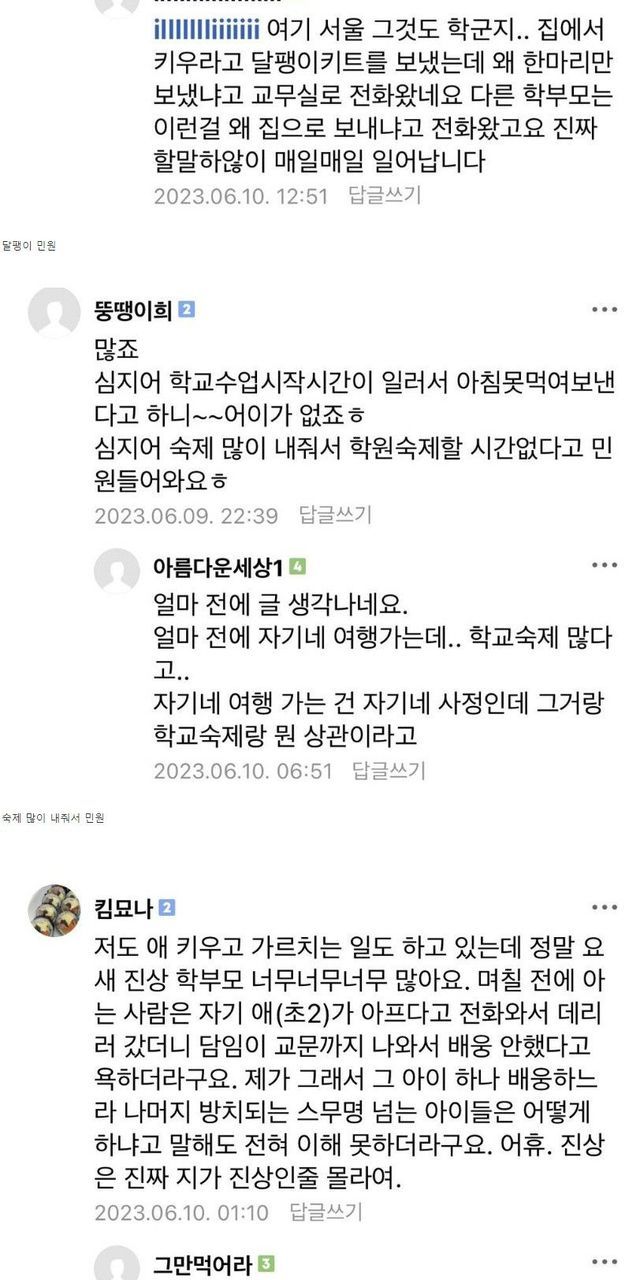 맘카페에 올라온 요즘 학부모가 학교에 넣는 민원 수준